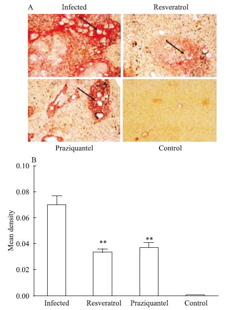 | Fig 1 The hepatic fibrosis in different groups A: The degree of hepatic fibrosis; B: The mean density of hepatic fibrosis. **P<0.01 vs infected group |
