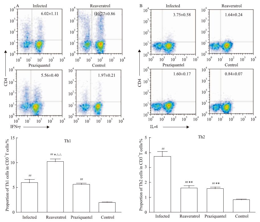| Fig 2 Proportions of Th1 (A),Th2 (B) cells in different groups *P<0.05,**P<0.01 vs infected group; ##P<0.01 vs control group; △△P<0.01 vs praziquantel group |