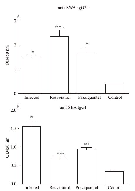 | Fig 3 Production of anti-SWA IgG2a (A) and anti-SEA IgG1 (B) *P<0.05,**P<0.01 vs infected group; ##P<0.01 vs control group; △P<0.05 vs praziquantel group |