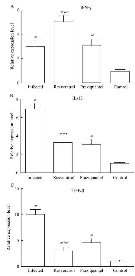 为了进一步阐明白藜芦醇抗日本血吸虫病肝脏纤维化的机制,又检测了与Th1/Th2免疫反应相关,同时又是参与肝脏纤维化发生发展的重要细胞因子INF-γ、IL-13、TGF-β的表达情况。结果如Fig 4所示,感染13周后,感染组、白藜芦醇治疗组、吡喹酮治疗组小鼠肝脏中的INF-γ、IL-13、TGF-β的mRNA表达水平都明显高于健康对照组小鼠(P<0.01)。并且白藜芦醇治疗组肝脏中的INF-γ mRNA表达水平较感染组和吡喹酮治疗组明显增高(P<0.05),但白藜芦醇治疗组肝脏中IL-13、TGF-β的mRNA表达水平明显低于感染组(P<0.01)。另外发现,白藜芦醇治疗组和吡喹酮治疗组小鼠肝脏IL-13、TGF-β的mRNA表达水平之间差异都没有统计学意义(P>0.05)。