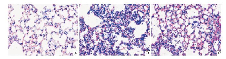 2.4 病理形态学采集采集小鼠双侧肺叶后,取右肺中叶,放入40 g·L-1多聚甲醛磷酸盐缓冲液中,固定48 h,组织脱水,石蜡包埋后切片,通过HE染色观察肺组织病理学改变。