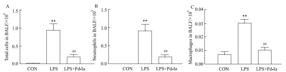 | Fig 2 Effects of Pd-Ia on inflammatory cell changes in BALF A:Effects of Pd-Ia on total cells in BALF; B: Effects of Pd-Ia on neutrophils cells in BALF; C: Effects of Pd-Ia on macrophages cells in BALF. **P<0.01 vs control;##P<0.01 vs LPS |