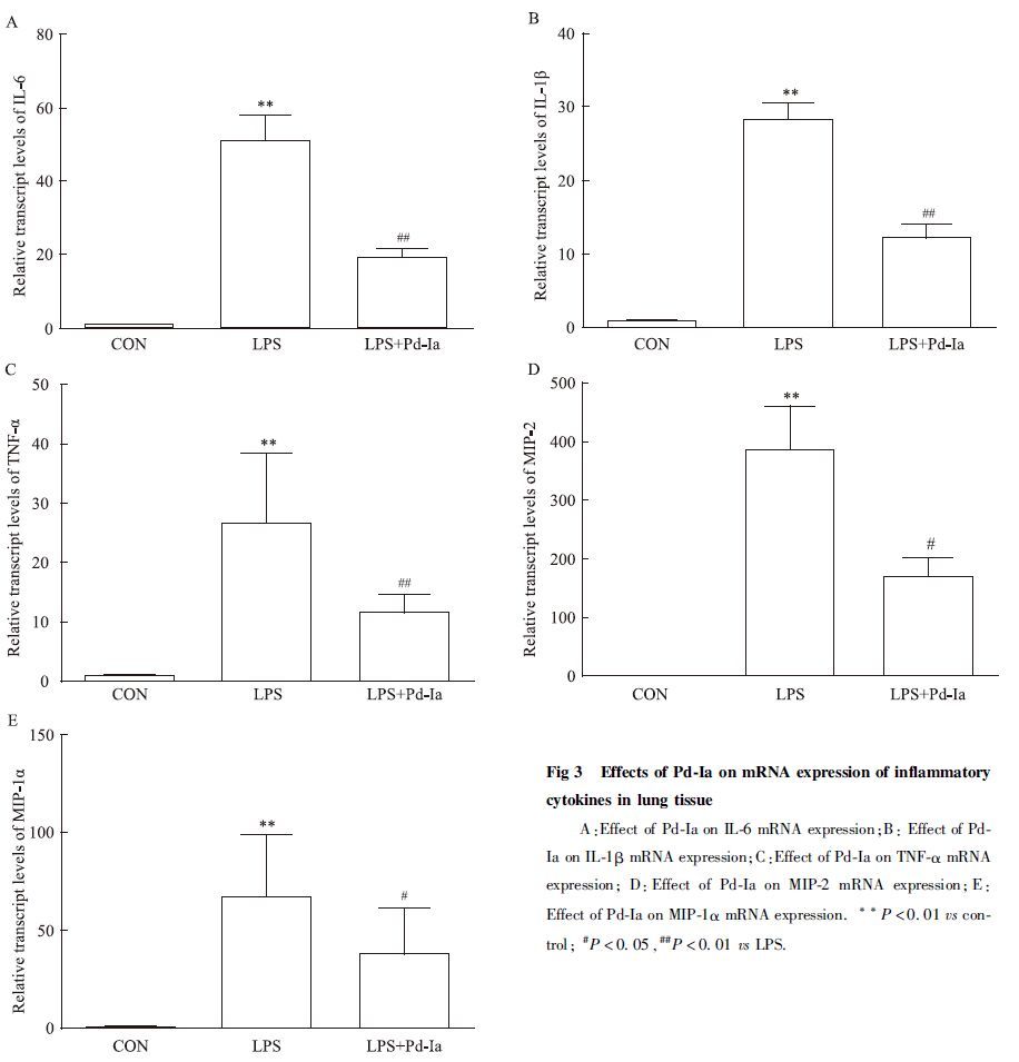 | Fig 3 Effects of Pd-Ia on mRNA expression of inflammatory cytokines in lung tissue A:Effect of Pd-Ia on IL-6 mRNA expression;B: Effect of Pd-Ia on IL-1β mRNA expression;C:Effect of Pd-Ia on TNF-α mRNA expression; D:Effect of Pd-Ia on MIP-2 mRNA expression;E:Effect of Pd-Ia on MIP-1α mRNA expression. **P<0.01 vs control; #P<0.05,##P<0.01 vs LPS. |