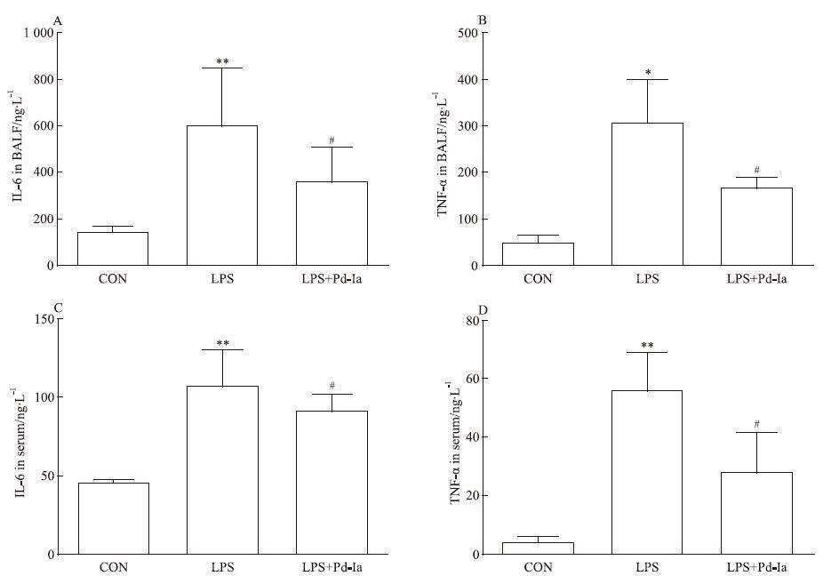 | Fig 4 Effect of Pd-Ia on inflammatory cytokine changes in BALF and serum A: Effect of Pd-Ia on IL-6 expression in BALF; B: Effect of Pd-Ia on TNF-α expression in BALF; C: Effect of Pd-Ia on IL-6 expression in serum; D: Effect of Pd-Ia on TNF-α expression in serum.*P<0.05,**P<0.01 vs control;#P<0.05 vs LPS |