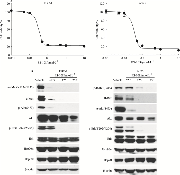 FS-108是本课题组与沈竞康研究员课题组合作开发的全新结构的Hsp90抑制剂,在分子、细胞及动物活体水平均显示出较强的活性[14],目前正在进行系统的临床前评价。为进一步阐明其抗肿瘤作用,我们在本实验中对FS-108在癌基因依赖肿瘤细胞EBC-1(MET扩增)和A375(B-Raf突变)中的相关生物学效应及机制进行考察,为后续的临床研究提供重要理论依据。