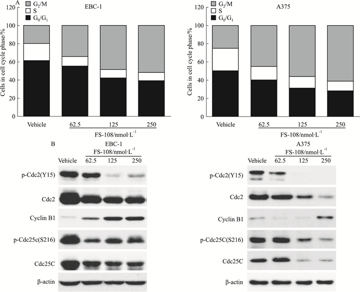 | Fig 2 Effects of FS-108 on cell cycle distribution of oncogene addicted EBC-1 and A375 cells A: Effects of FS-108 on cell cycle distribution. EBC-1 and A375 cells were treated with FS-108 at 62.5, 125 and 250 nmol·L-1 for 24 h. Cell cycle distribution was analyzed by FACS after propidium iodide staining; B: Effects of FS-108 on G2/M transition regulators. EBC-1 and A375 cells were treated with FS-108 at 62.5, 125 and 250 nmol·L-1 for 24 h and cells lysates were immunoblotted with indicated antibodies |