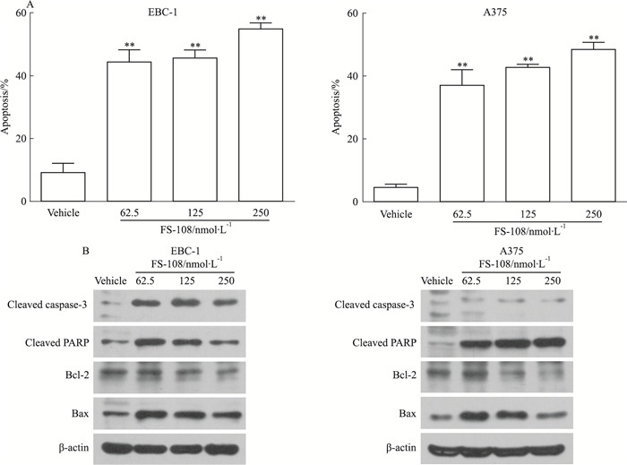| Fig 3 Effects of FS-108 on apoptosis induction of oncogene addicted EBC-1 and A375 cells A: Effects of FS-108 on apoptosis induction. EBC-1 and A375 cells were treated with FS-108 at 62.5, 125 and 250 nmol·L-1 for 72 h. Apoptosis was analyzed by FACS after Annexin V-FITC/PI staining.**P < 0.01 vs vehicle; B: Effects of FS-108 on apoptosis regulators. EBC-1and A375 cells were treated with FS-108 at 62.5, 125, 250 nmol·L-1 for 72 h and cell lysates were immunoblotted with indicated antibodies |
