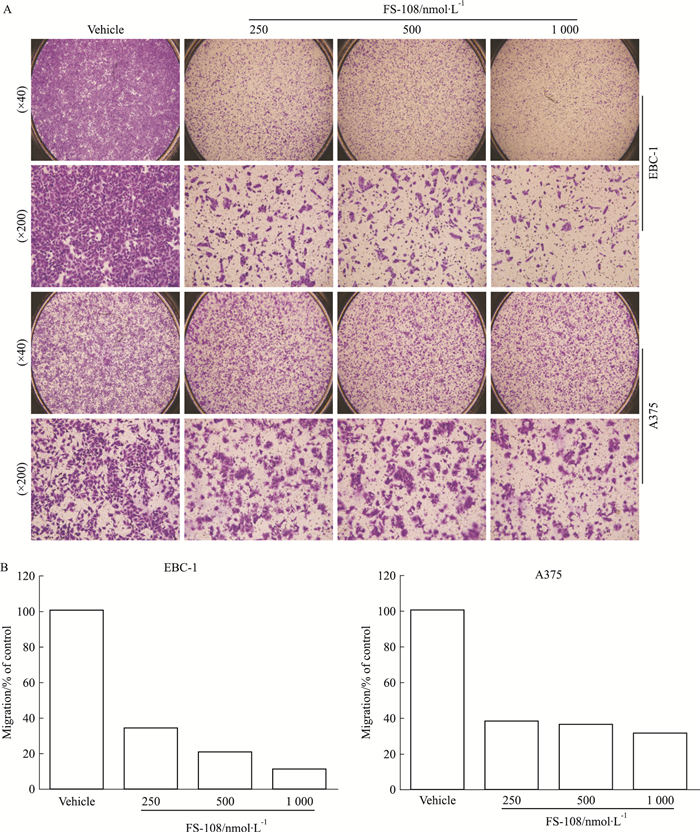 | Fig 4 Effects of FS-108 on migration of oncogene addicted EBC-1 and A375 cells Effects of FS-108 on cell motility. EBC-1 and A375 cells were treated with FS-108 at 250, 500, 1 000 nmol·L-1 for 12 h. Then, the migrated cells were observed using fluorescence microscope(A), and statistically analyzed(B) |