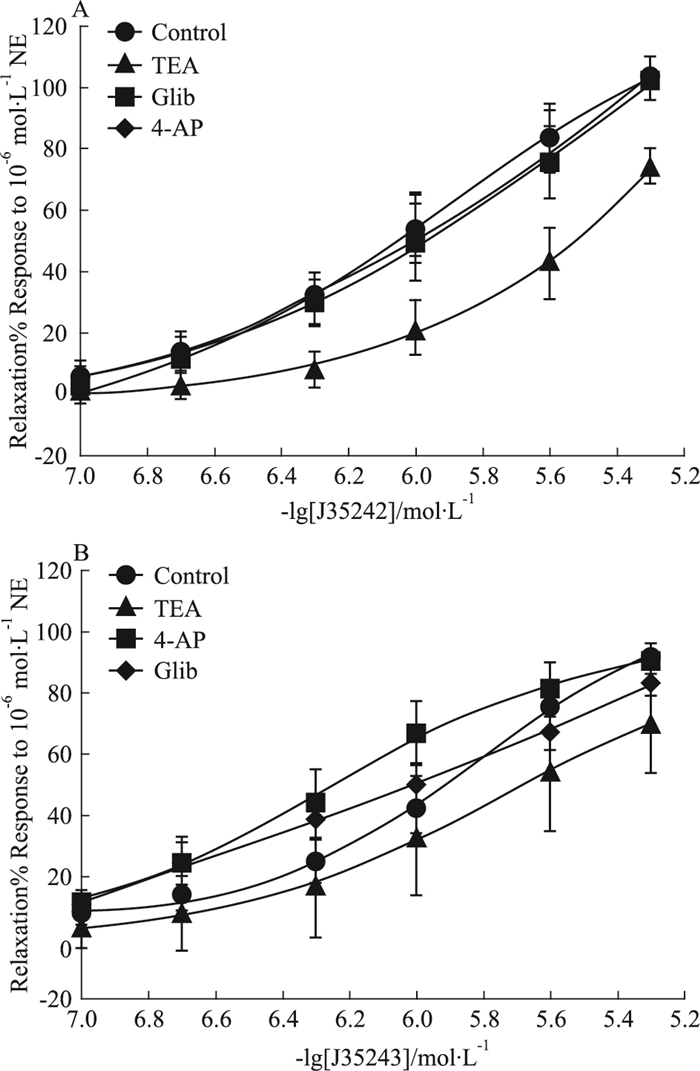 | Fig 5 Influences of TEA(5 mmol·L-1), Glib (10 μmol·L-1), and 4-AP (100 μM) on relaxant effect of J35242(A) and J35243(B) in endothelium-denuded aorta rings pre-contracted by NE. (x±s=6) |