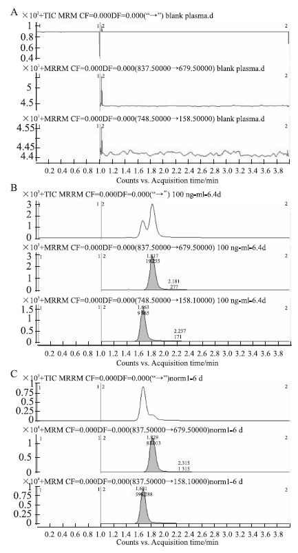 2 结果 2.1 方法学考察与验证 2.1.1 方法的专属性按照“1.4”的质谱条件,分别对罗红霉素和内标克拉霉素进行质谱全扫,测得罗红霉素的核质比为:m/z 837.5→679.5(Fig 2)、克拉霉素为:m/z 748.5→158.1(Fig 2)。大鼠空白血浆、空白血浆外加药物、大鼠给药后血浆样品经处理后的MRM模式色谱图见Fig 3,由图可见,罗红霉素与内标克拉霉素在血浆中无内源性干扰。罗红霉素的出峰时间为1.8 min,内标的出峰时间为1.6 min。