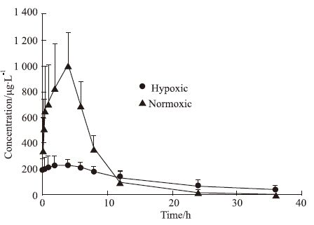 罗红霉素脂溶性很强,容易透过生物膜,一般通过一级动力学被动扩散方式进行体内转运。而低氧状态下,药物的吸收和体存量减少,可能一方面源于外排蛋白,另一方面也可能是缺氧造成肠胃排空变慢,pH变化影响药物电离性,或者造成胃肠局部微环境改变,进而影响药物吸收[3, 4, 18]。低氧影响罗红霉素在动物体内代谢转运和药代动力学过程的分子机制尚待进一步研究。我们的研究结果表明,低氧可以明显降低罗红霉素在大鼠体内的达峰浓度和体存量,降低血浆药物浓度水平,进而影响药物治疗,结果为罗红霉素在低氧状态下的给药方案优化和调整提供了重要的实验依据。与常氧状态相比,缺氧状态下,罗红霉素的体内消除半衰期没有发生明显变化,但体内吸收和暴露量明显降低。因此,在缺氧状态下临床使用罗红霉素时,给药次数和时间间隔不变,但给药剂量至少需要增大1倍。