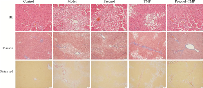 | Fig 1 HE (×200), Masson (×100) and Sirius red (×100) staining of liver tissue in control, model, paeonol or/and TMP treatment group |