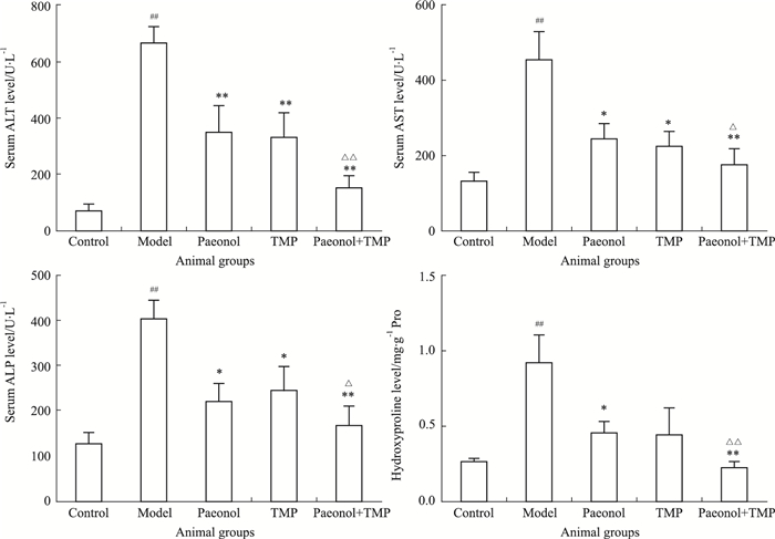 如Fig 2所示,造模后大鼠血清ALT、AST、ALP和羟脯氨酸水平明显高于正常对照组(P < 0.01)。与模型组比较,川芎嗪和丹皮酚组ALT、AST、ALP和羟脯氨酸水平明显降低(P < 0.05),联合用药组的效果更加明显(P < 0.01),联合用药组与川芎嗪或丹皮酚组比较差异有统计学意义(P < 0.05)。