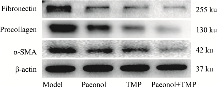 | Fig 3 Paeonol or/and TMP inhibits expression of ECM related protein in liver tissue Western blot analyses of α-SMA, fibronectin and procollagen. β-actin was used as an invariant control for equal loading. |