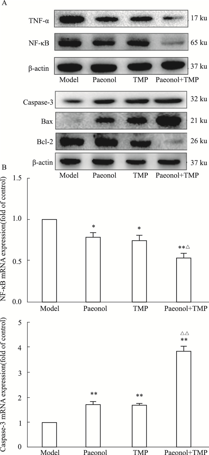 | Fig 4 Interference with inflammation and apoptosis signaling was associated with paeonol or/and TMP inhibition of activation of HSC A:Western blot analyses of TNF-α, NF-κB p65, Bax, caspase-3, Bcl-2. β-actin was used as an invariant control for equal loading. B: Real time-PCR analyses of NF-κB and caspase-3, GAPDH was used as an invariant control for equal loading. *P < 0.05, **P < 0.01 vs model; △P < 0.05, △△P < 0.01 vs paeonol or TMP. |