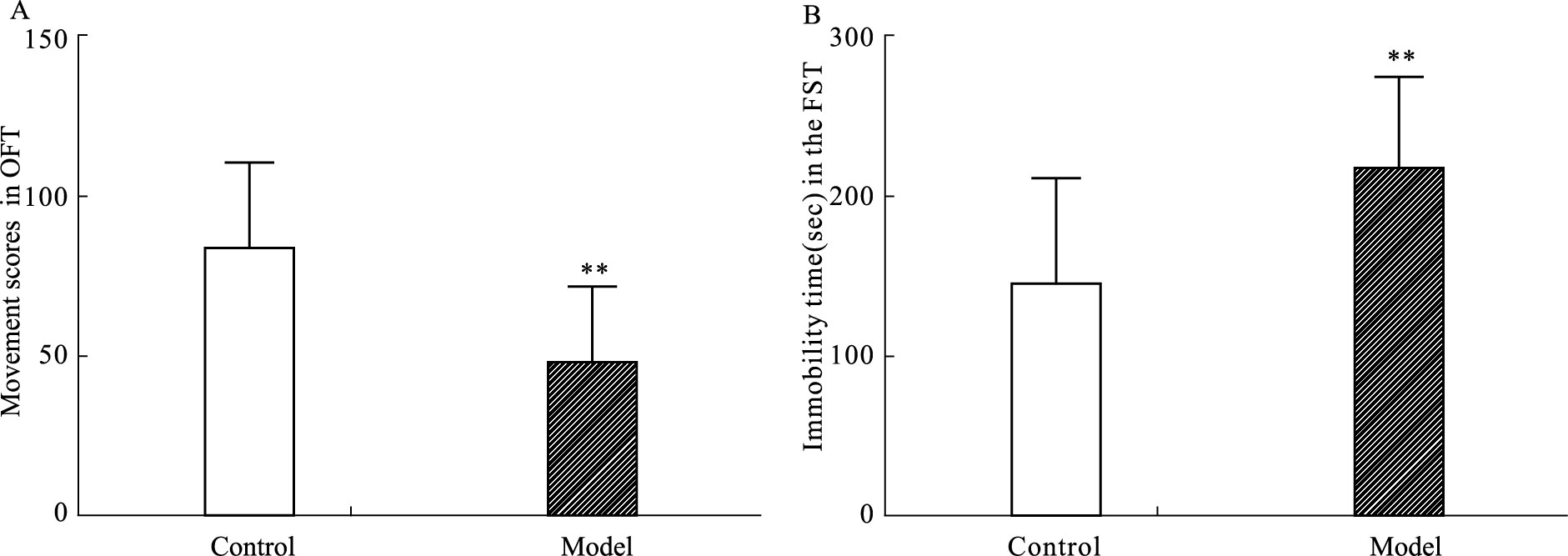 2 结果 2.1 CUS对大鼠行为的影响开场实验结果显示,模型组大鼠开场实验得分较对照组大鼠明显降低(P<0.01),提示模型组大鼠出现明显焦虑样抑郁行为;强迫游泳实验结果显示,模型组大鼠强迫游泳不动时间较对照组大鼠明显延长(P<0.01)(Fig 1),提示模型组大鼠出现明显绝望样抑郁行为。
