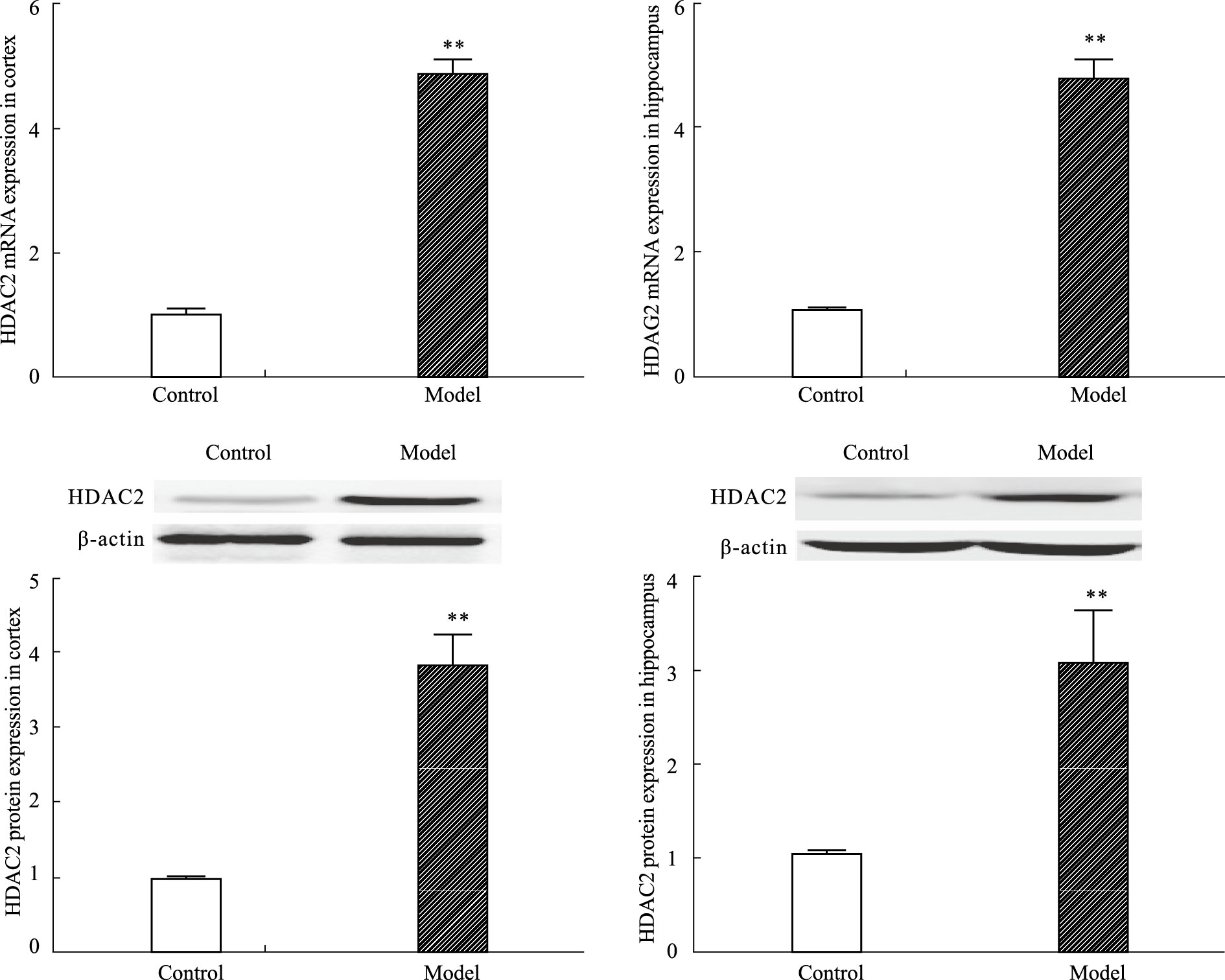 与对照组大鼠相比,模型组大鼠前脑皮层和海马HDAC2 mRNA(皮层P<0.01,海马P<0.01)及蛋白(皮层P<0.01,海马P<0.01)表达均明显增加(Fig 2)。提示模型组大鼠脑内出现明显HDAC2表达增高。