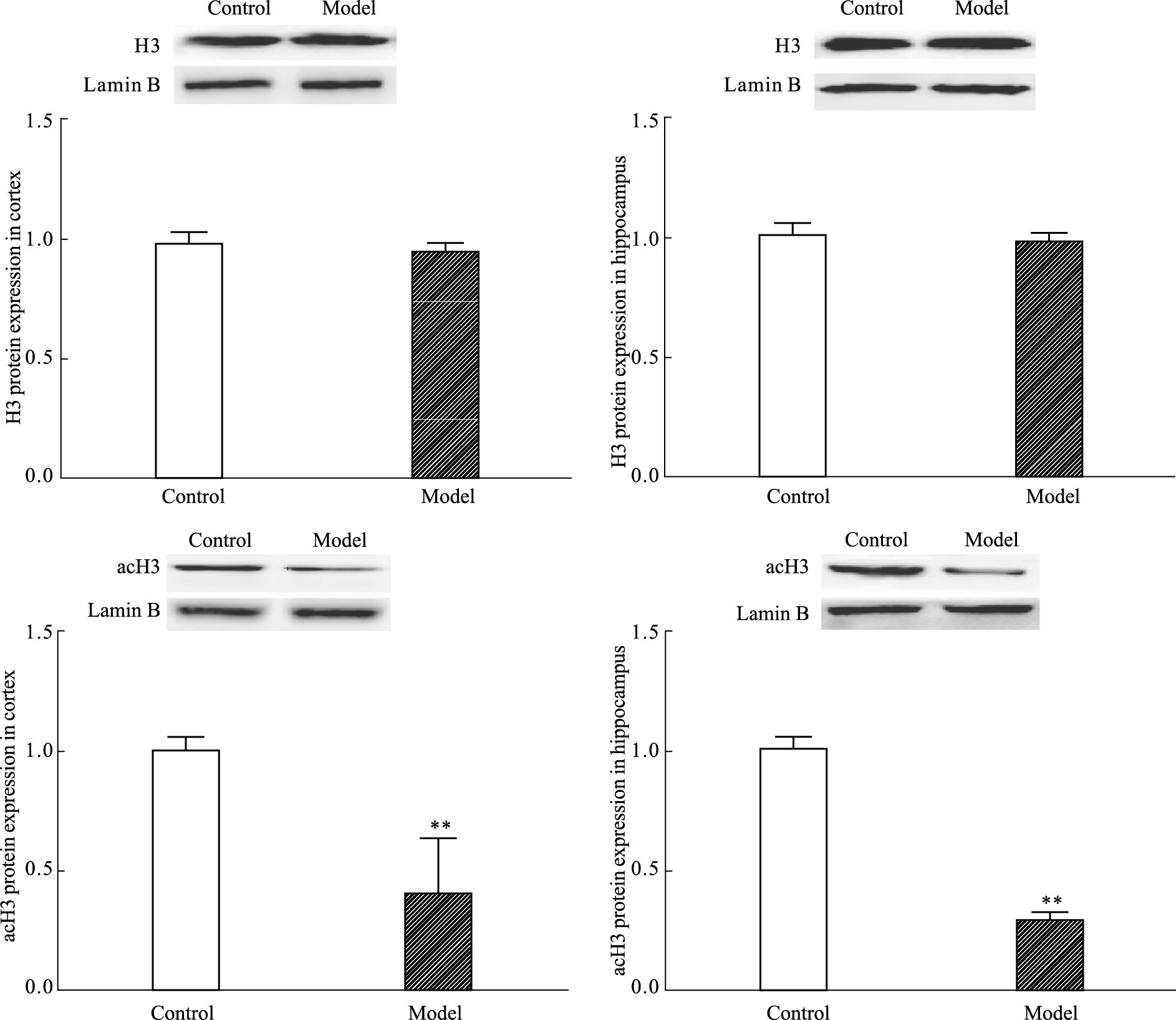 与对照组大鼠相比,模型组大鼠前脑皮层和海马H3蛋白表达差异无显著性,acH3蛋白水平均明显降低(皮层P<0.01,海马P<0.01)(Fig 3)。提示模型组大鼠脑内H3水平无明显变化而H3乙酰化修饰水平明显降低。