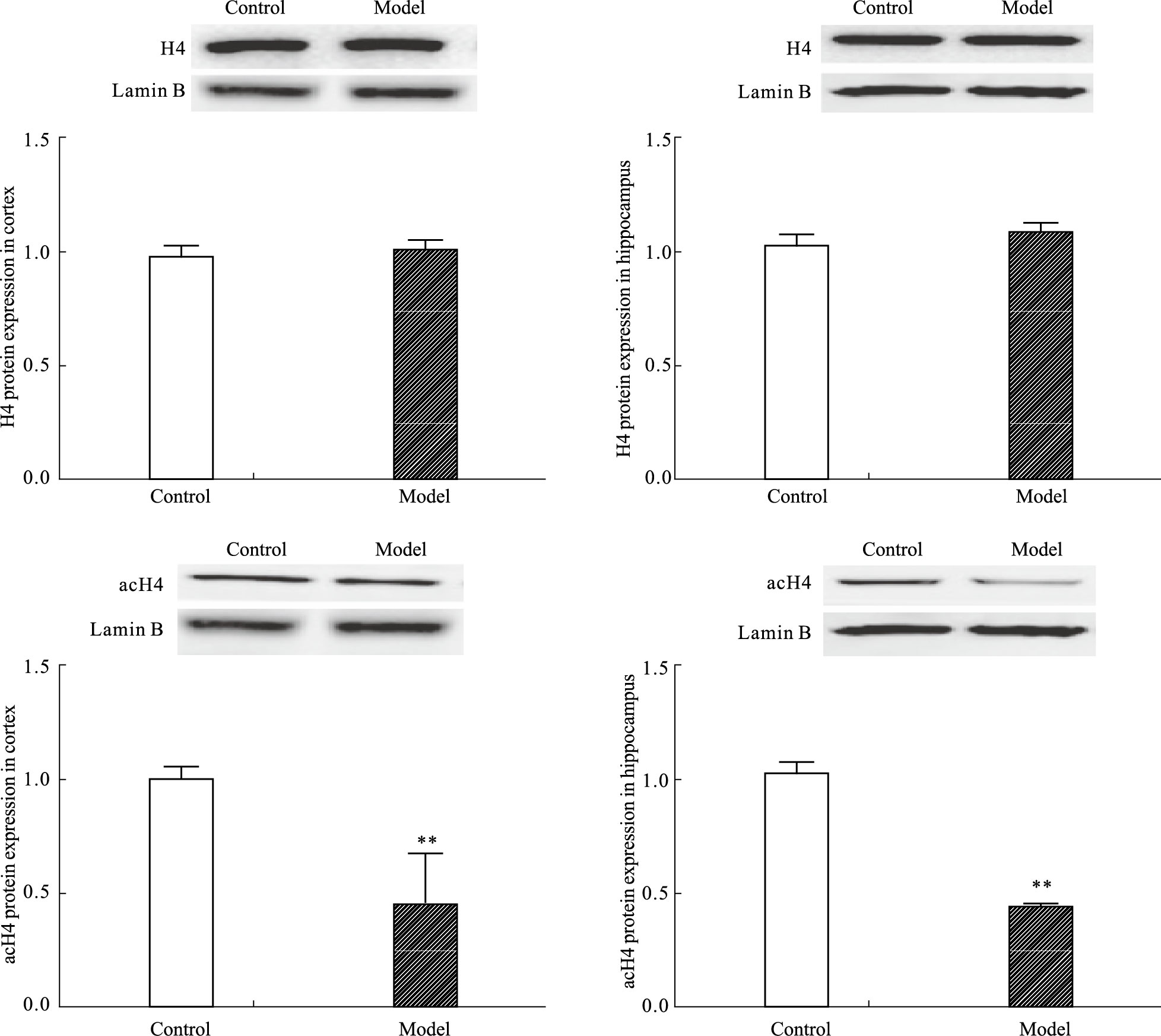 与对照组大鼠相比,模型组大鼠前脑皮层和海马H4蛋白表达差异均无显著性,acH4蛋白水平均明显降低(皮层P<0.01,海马P<0.01)(Fig 4)。提示模型组大鼠脑内H4表达无明显变化而H4乙酰化修饰水平明显降低。