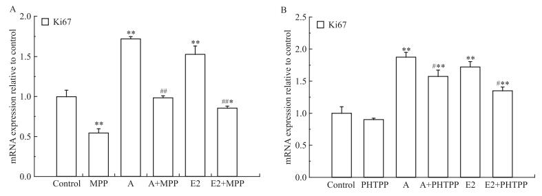 | Fig 10 Effects of acacetin, E2, ERα inhibitor and ERβ inhibitor on Ki67 mRNA expression in T47D cells A:ERα inhibitor (MPP); B:ERβ inhibitor (PHTPP).*P < 0.05, **P < 0.01 vs control; #P < 0.05, ##P < 0.01 vs acacetin or E2 group. |