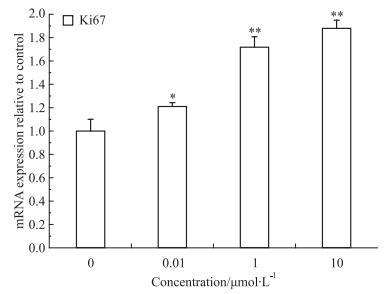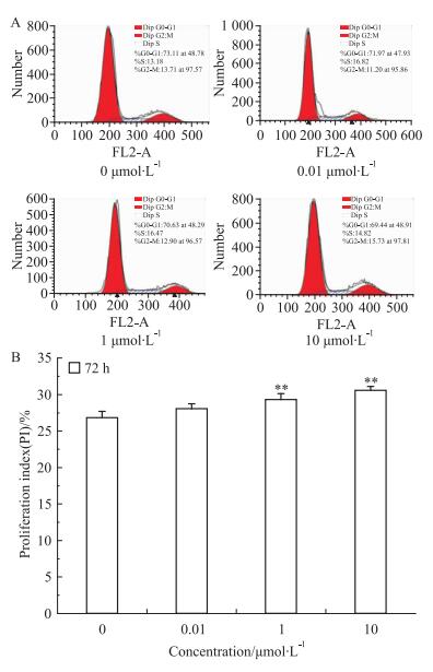 3 结果 3.1 刺槐素对T47D细胞增殖的影响首先,分别使用0.001、0.01、0.1、1、10 μmol·L-1刺槐素处理人乳腺癌T47D细胞。如Fig 1所示, 与对照组相比,刺槐素对T47D细胞增殖具有明显的促进作用,呈现剂量依赖效应;并且随作用时间的延长,刺槐素对T47D细胞的促增殖效应增强,72 h作用最明显(P < 0.01)。0.01、1、10 μmol·L-1刺槐素处理人乳腺癌T47D细胞,流式细胞仪检测细胞周期结果显示(Fig 2),与对照组相比,刺槐素作用于T47D细胞72 h后,可以增加S期和G2/M细胞的比例,促进细胞增殖,并呈现出浓度依赖性。同时,qPCR结果如Fig 3所示,与对照组相比,刺槐素给药后,可上调Ki67基因表达。