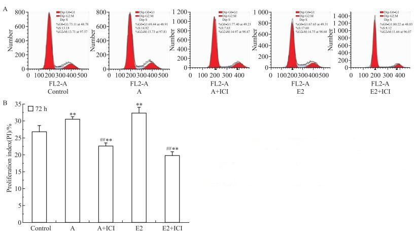 | Fig 5 Effects of acacetin, E2 and ICI 182.780 on cell cycle of T47D cells A: Cell cycle distribution; B: Proliferation index.**P < 0.01 vs control; ##P < 0.01 vs acacetin or E2 group |