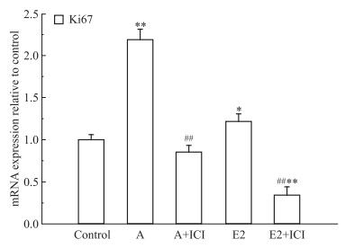 使用10 μmol·L-1刺槐素及0.01 μmol·L-1 E2分别处理T47D细胞24、48、72 h,结果表明(Fig 4),刺槐素和E2能促进T47D细胞增殖,并呈现出明显的时间依赖性。然后,使用1 μmol·L-1 ICI 182.780与刺槐素或E2共同处理T47D细胞,结果表明(Fig 4),与刺槐素或E2单独处理组比较,细胞增殖率明显降低。细胞周期检测结果显示(Fig 5),与对照组相比,10 μmol·L-1刺槐素作用于T47D细胞72 h后,可以增加S期和G2/M细胞的比例(P < 0.01),促进细胞增殖,但该作用稍弱于E2组;当加入ICI 182.780后,S期和G2/M细胞的比例明显下降。同时,Ki67检测结果显示(Fig 6),与对照组相比,刺槐素可以升高Ki67 mRNA的水平,刺槐素联合ICI 182.780处理组与刺槐素单独处理组相比,可抑制Ki67 mRNA的表达。