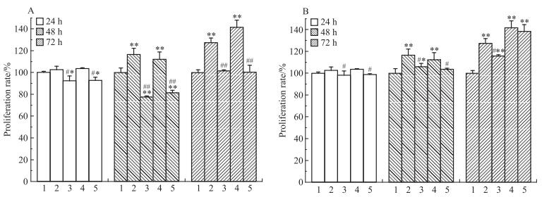 | Fig 8 Effects of acacetin, E2, ERα inhibitor and ERβ inhibitor on proliferation rate of T47D cells A: ERα inhibitor (MPP). 1: Control; 2: A; 3: A+MPP; 4: E2; 5: E2+MPP. B: ERβ inhibitor (PHTPP). 1: Control; 2: A; 3: A+PHTPP; 4: E2; 5: E2+PHTPP.*P < 0.05, **P < 0.01 vs control; #P < 0.05, ##P < 0.01 vs acacetin or E2 group |