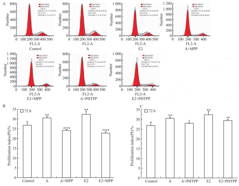 | 图 9 Effects of acacetin, E2, ERα inhibitor and ERβ inhibitor on cell cycle of T47D cells A:Cell cycle distribution; B: ERα inhibitor (MPP); C:ERβ inhibitor (PHTPP).*P < 0.05, **P < 0.01 vs control; #P < 0.05, ##P < 0.01 vs acacetin or E2 group. |
