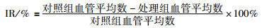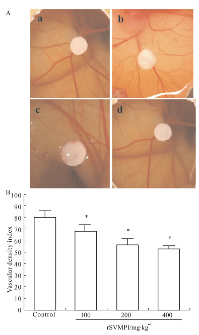 选择定性滤纸,用打孔器制成直径5 mm的圆片,双蒸水润湿,湿热高压灭菌,烘干备用。将制备好的直径5 mm定性滤纸圆片置于CAM和卵黄囊膜外2/3血管相对较少的部位 (肉眼观),然后用微量进样器向滤纸分别加入终浓度为100、200、400 mg·L-1的rSVMPI (20 μL),对照组加入等量PBS,每个浓度12个胚蛋。无菌透明胶带封住卵窗,标记后,置37℃培养箱继续孵育72 h。揭去封窗的透明膜,数码相机拍照记录结果,用图像分析软件Image-Pro Plus 6.0处理图像,计数测量区 (以加药部位为中心,直径为1 cm的圆) 血管数目,计算单位面积的血管密度指数 (vascular density index),并且根据下列公式计算血管抑制率 (inhibition rate, IR)。