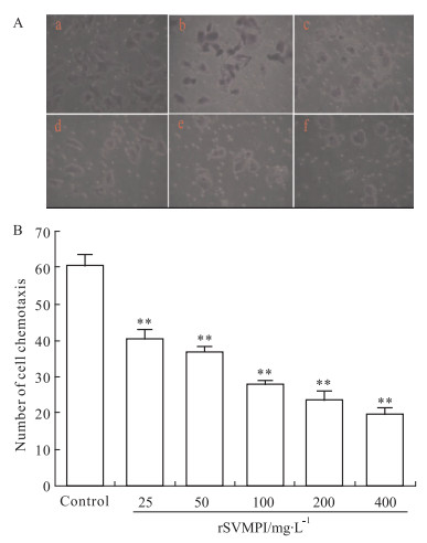3.3.5 rSVMPI对HUVECs体外趋化能力的影响应用改良的Boyden小室检测25、50、100、200、400 mg·L-1的rSVMPI处理24 h后,HUVECs穿越重建基底膜的细胞数,结果如Fig 2所示,5种不同浓度的rSVMPI处理后穿越重建基底膜的HUVECs细胞数目分别是 (40.4±2.7)、(36.8±1.5)、(27.8±1.3)、(23.6±2.3) 和 (19.7±1.9),与对照组 (60.8±2.9) 相比,差异有统计学意义 (P < 0.01),趋化抑制率分别是33.55%、39.47%、54.28%、61.18%和67.6%。
