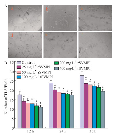 | Fig 3 Effect of rSVMPI on TLS of HUVECs A: TLS of HUVEC after 24 h (×200). a:control; b:25 mg·L-1 rSVMPI; c:50 mg·L-1 rSVMPI; d:100 mg·L-1 rSVMPI; e:200 mg·L-1 rSVMPI; f: 400 mg·L-1 rSVMPI; B: The number of TLS after 12 h, 24 h, 36 h.*P < 0.05 vs control |