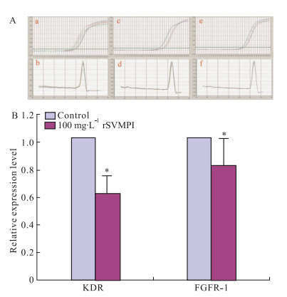 | Fig 4 Effect of rSVMPI on expression levels of KDR and FGFR-1 in HUVECs by real-time PCR A. The amplification plots and dissociation curve of real time PCR. a, b:GAPDH; c, d:KDR; e, f:FGFR-1. B:Relative expression levels of KDR and FGFR-1 in HUVECs by rSVMPI treatment.*P < 0.05 vs control |