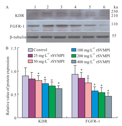 鉴于KDR与FGFR-1所介导的信号转导通路在肿瘤血管生成过程中的重要作用,本实验采用实时定量PCR和免疫印迹技术分析rSVMPI对HUVECs细胞KDR、FGFR-1 mRNA和蛋白表达水平的影响。结果如Fig 4、5所示,rSVMPI处理组中的KDR和FGFR-1mRNA的相对表达量分别是0.605和0.804,差异具有统计学意义 (P < 0.05);与对照组相比较,rSVMPI处理组中的KDR和FGFR-1的蛋白表达水平明显下降 (P < 0.05),并呈剂量依赖性。这些资料表明rSVMPI可抑制HUVECs细胞KDR和FGFR-1的表达。