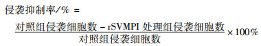 2.3.4 rSVMPI对HUVECs体外趋化能力的影响根据文献采用Boyden小室分析方法[8]进行检测。Transwell小室置于24孔细胞培养板中,取-80°C冻存的Matrigel (8.6 g·L-1) 与无血清的细胞培养液于冷EP管中以1 :3稀释,混匀后,取20 μL滴加在小室聚碳酸酯膜内侧。取-80℃冻存的Fibronectin (1 g·L-1) 与无血清细胞培养液于冷EP管中以1 :1稀释,混匀后,取20 μL滴加在小室聚碳酸酯膜外侧。收集对数生长期的HUVECs细胞,PBS洗涤,重悬于分别含有终浓度为25、50、100、200、400 mg·L-1 rSVMPI的1%FBS培养液中,于37 ℃、5% CO2温育2 h后,以每孔1×105个细胞加入小室上室,下室加700 μL含10%FBS及VEGF (终浓度为20 mg· L-1) 的细胞培养液,置37 ℃、5% CO2培养24 h,取出小室,弃除上室液体,PBS洗涤,用棉签擦尽上室膜面未穿膜的细胞及Matrigel,室温下结晶紫染色10 min,PBS小心冲洗,200倍光镜下计数5个视野的侵袭细胞数,取其平均值,以侵袭细胞的相对数目表示肿瘤细胞的侵袭能力,每个浓度设5个复孔。