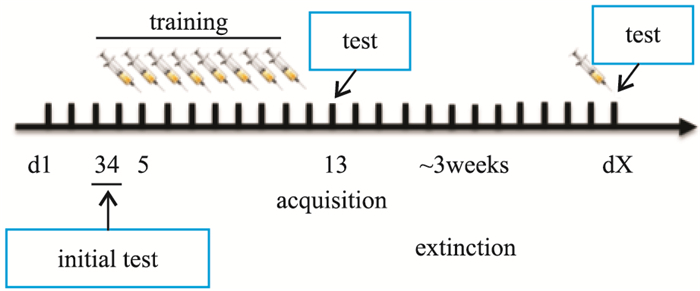 1.4 实验方法 1.4.1 条件性位置偏爱模型的建立所用装置设计与许月芳等[3]相同,但箱体更大,黑、白箱 (40×40×65) cm3,中间箱 (40×15×65) cm3。训练方式 (Fig 1):d 1、2为动物适应期,d 3、4上午9:00开始前测 (initial test),时间15 min,根据自然偏爱结果 (2次前测平均值),采用抗衡设计分为吗啡组和盐水对照组,使偏爱白箱的大鼠用黑箱伴药训练,偏爱黑箱的大鼠用白箱伴药训练,最终使吗啡组和盐水对照组均为一半伴白箱训练,一半伴黑箱训练。每天训练1轮,每轮上下午各注射1次 (吗啡10 mg·kg-1 s.c.,或生理盐水s.c.),每次训练45 min,共8轮。d 13为测试期,打开通道,动物放入中间箱任其自由穿梭,记录15 min内在伴药侧停留时间,测试CPP形成。熄灭:饲养条件不变,每周1次将动物放进中间箱,打开通道,任其自由穿梭15 min并记录,连续2 d的测试结果阴性认为CPP完全熄灭。重建:熄灭后的两组动物给予吗啡 (2.5 mg·kg-1) 后立即放入中间箱,测试15 min,检测CPP是否被诱导重建。