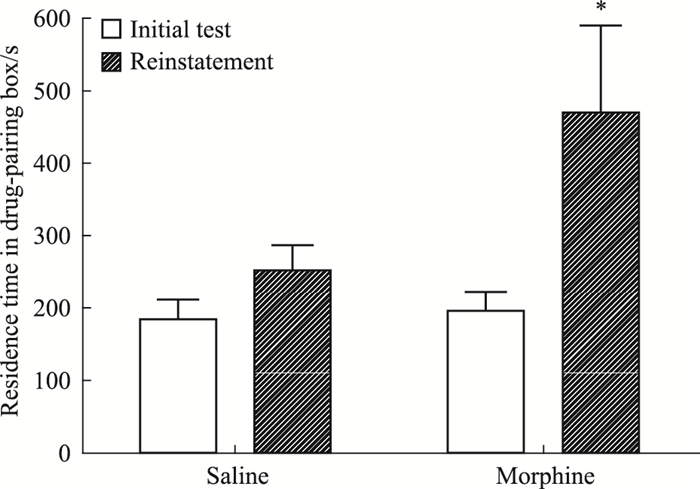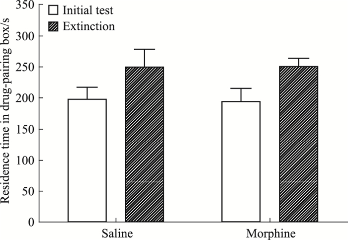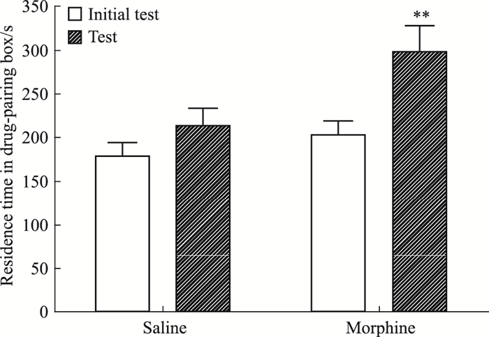 CPP模型是利用条件性线索研究关联性学习记忆的一种动物模型,通过一段时间将条件性线索与药物效应 (非条件刺激) 关联的训练,使这种条件线索能够诱发动物对非条件刺激的记忆[8]。本实验采用完全抗衡设计,将所有受试动物的自然偏性均衡分配,并设生理盐水组做同步对照。在训练周期安排上,也充分考虑训练次序、箱号、时间的影响,做出相应的均衡设计,尽可能排除因实验设计不合理和实验装置的个体差异对结果造成的影响。训练8轮后的测试表明大鼠形成CPP,窗口大约100 s左右。3周后该关联性记忆已经消退,再用小剂量吗啡注射诱导则可重建原有关联记忆。整个实验过程中,生理盐水对照组大鼠在CPP形成、熄灭和重建的不同阶段其平均伴药箱停留时间都稳定在200~250 s左右,且两组动物的体质量在整个实验过程中同等程度和趋势增加,状态无异常,表明CPP实验条件非常稳定,实验结果可信赖。