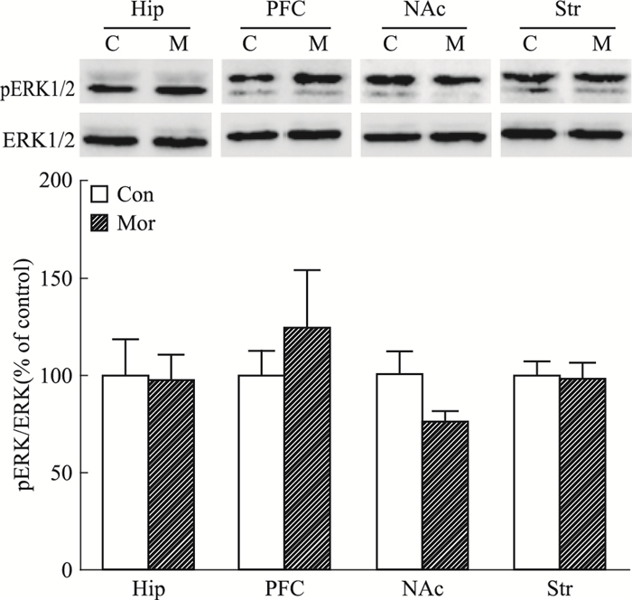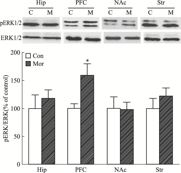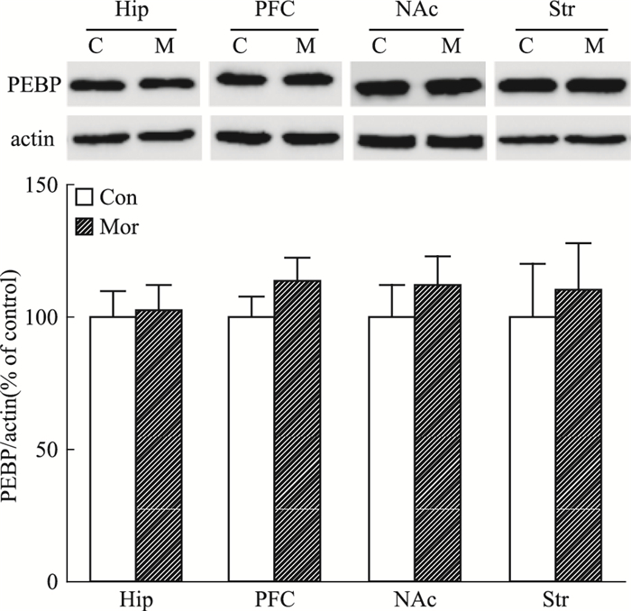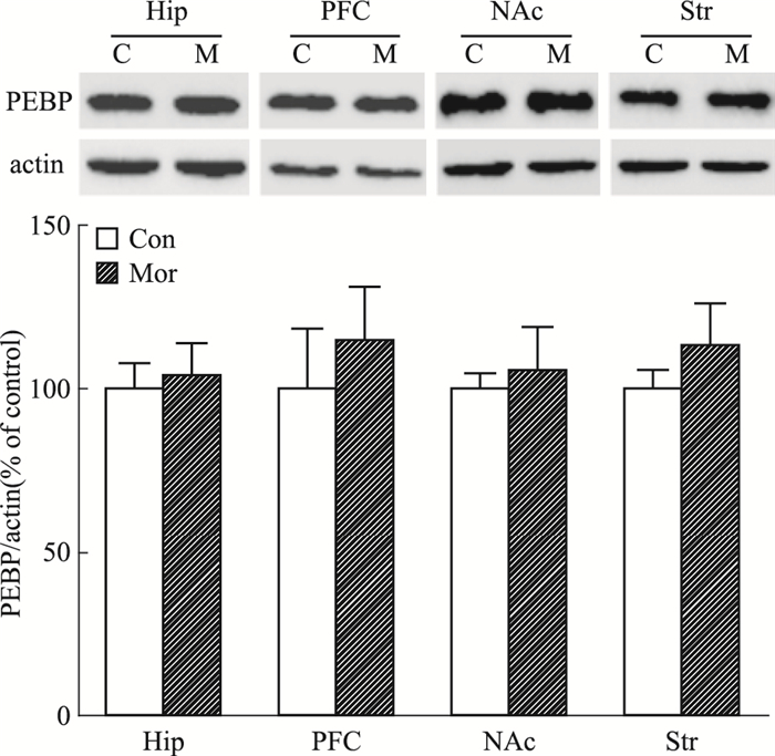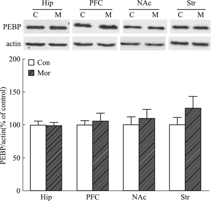 1.5 统计学分析采用Alpha View软件中自带的光密度分析模块,自动扣除背景,手动框选条带,获取光密度值。全部统计采用GraphPad 5.0软件 (美国),ERK的活性用总ERK量均一化,PEBP的表达量用β-actin均一化。所用统计量表示为x ± s,CPP对照组和吗啡组的比较采用双因素方差分析,各脑区蛋白对照组和吗啡组的比较采用t检验。