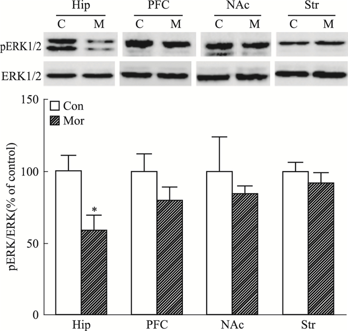 | Fig 4C Acticity of ERK in different brain regions on CPP reinstatement (n=8) C, Con:saline control group; M, Mor:morphine group, *P < 00.05 vs control |