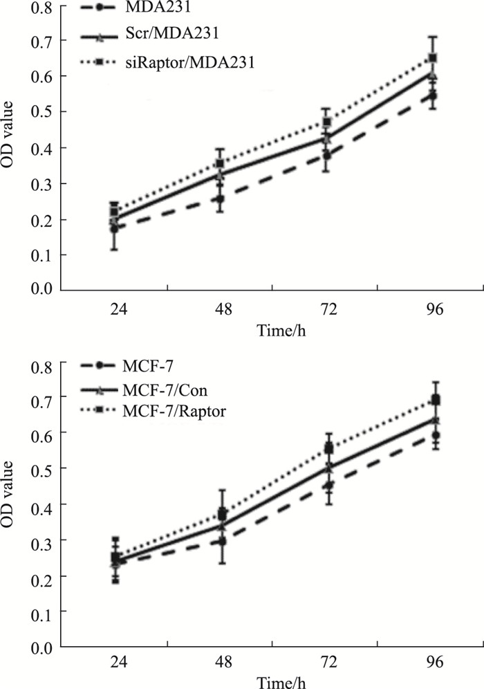 1.2 方法 1.2.1 细胞培养MDA231于10% FBS的RPMI 1640培养基、空气、37 ℃培养。乳腺癌细胞MCF-7于10% FBS的MEM培养基、5% CO2、37 ℃培养。将转染小RNA干扰质粒的MDA-MB-231乳腺癌细胞作为siRaptor/MDA231组,转染空载质粒的Scr/MDA231细胞作为对照组,转染过表达质粒的MCF-7乳腺癌细胞作为MCF-7/Raptor组,转染空载质粒的MCF-7/Con细胞作为对照组。