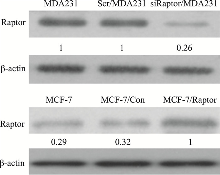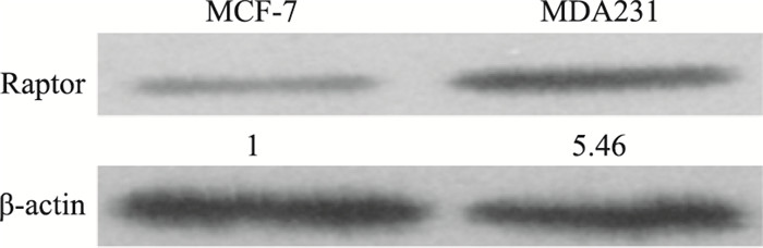 | Fig 2 Expression of Raptor protein in MCF-7 and MDA231 Total protein was isolated from MCF-7 and MDA231.β-actin was used as a loading control. Western blot was repeated at least three times. |