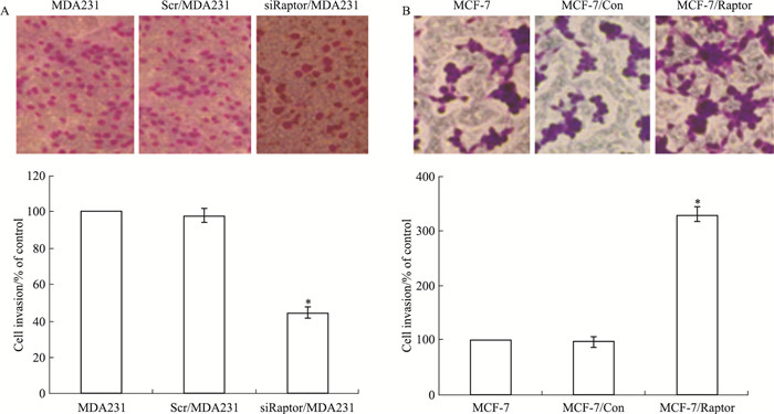 | Fig 4 Influence of Raptor on invasion capacity in various breast cancer cells The number of cells in siRaptor/MDA231 group was significantly reduced (A) and in MCF-7/Raptor group, the number of cells was significantly increased (B).*P < 0.05 vs Scr/MDA231 or MCF-7/Con |