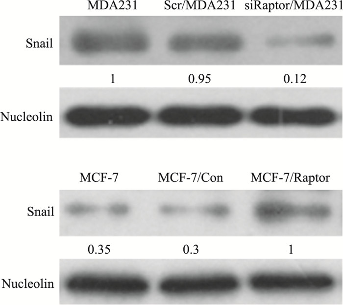 | Fig 6 The protein levels of Snail ingroups of various breast cancer cells Nucleolin was used as a loading control. Western blot was repeated at least three times. |