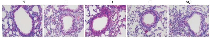 Fig 1 Effect of SQ22536 and forskolin on lung histopathological changes of LPS-induced acute lung injury mice(HE staining, ×400) N:Normal saline; L: LPS; D: LPS+Dexamethason; F:LPS+Forskolin; SQ: LPS+SQ22536. |