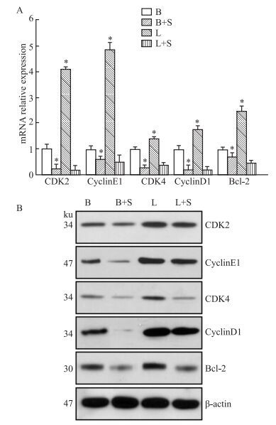 | Fig 1 Effects of SAHA on expressions of cell cycle regulators in MCF-7 breast cancer cells A: Quantitative real-time PCR; B: Western blot. B: Basal; B+S: Basal+SAHA; L: Leptin; L+S: Leptin+SAHA. *P < 0.05 vs basal |