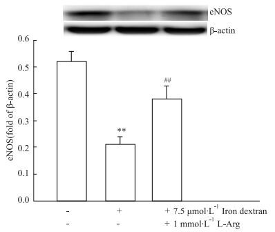 | Fig 2 Iron overload down-regulated eNOS expression in HUVECs(x±s, n=8) **P < 0.01 vs Control; ##P < 0.01 vs Iron |