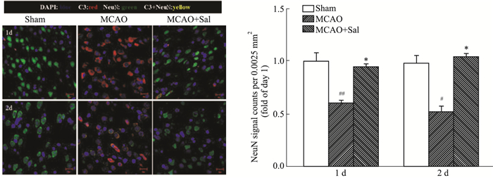 3 结果 3.1 红景天苷对MCAO模型大鼠缺血侧C3、NeuN表达的影响MCAO造模1、2 d后,模型组C3均有明显上升,NeuN表达明显下降。红景天苷给药后,可使C3的表达明显下降,NeuN的表达上升,且差异具有显著性(P<0.05)。对C3以及NeuN的蛋白表达量进行检测,发现大鼠造模1、2 d后,与假手术组相比,模型组的C3表达明显上升,而NeuN的表达明显下降,经由红景天苷处理之后,可逆转C3以及NeuN的蛋白量表达,差异具有显著性(P<0.01),见Fig 1、2。