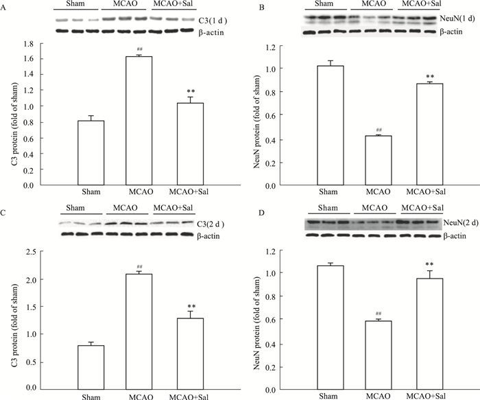 2 方法 2.1 动物分组及给药方法第1批:大鼠随机分为假手术组(sham)、模型组(MCAO)、红景天苷给药组(MCAO+Sal),每组15只。造模成功后,分别腹腔注射生理盐水或红景天苷(100 mg·kg-1),给药2 d。取缺血侧的脑组织,用于实验。第2批:大鼠随机分成溶剂假手术组(sham)、C3aR抑制剂假手术组(C3aR+sham)、模型组(MCAO)、C3aR抑制剂模型组(C3aR+MCAO)、给药组(MCAO+Sal)、C3aR抑制剂给药组(C3aR+MCAO+Sal),共6组,每组10只。侧脑室注射C3aR抑制剂或空白溶剂后30 min内,除假手术组外,其余均进行MCAO造模。造模后,连续腹腔注射生理盐水或红景天苷(100 mg·kg-1)2 d,取缺血侧脑组织用于实验。