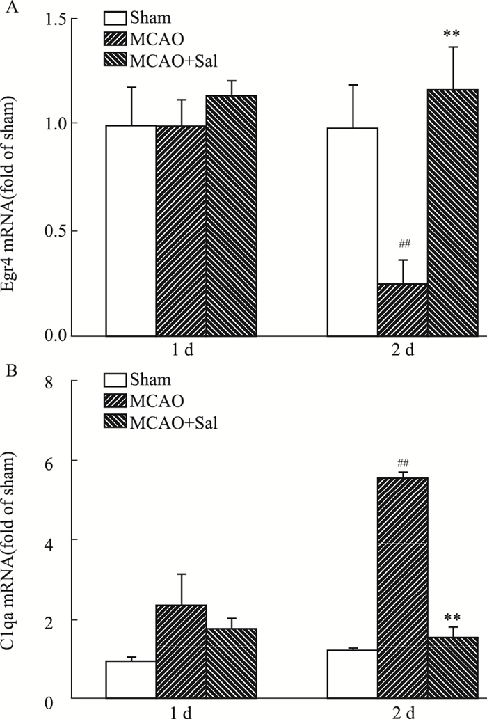 | Fig 3 Differential effects of salidroside on Egr4(A) and C1qa(B) mRNA after 1d and 2d ischemic/reperfusion injury (n=3) ##P < 0.05 vs sham; **P < 0.01 vs MCAO |