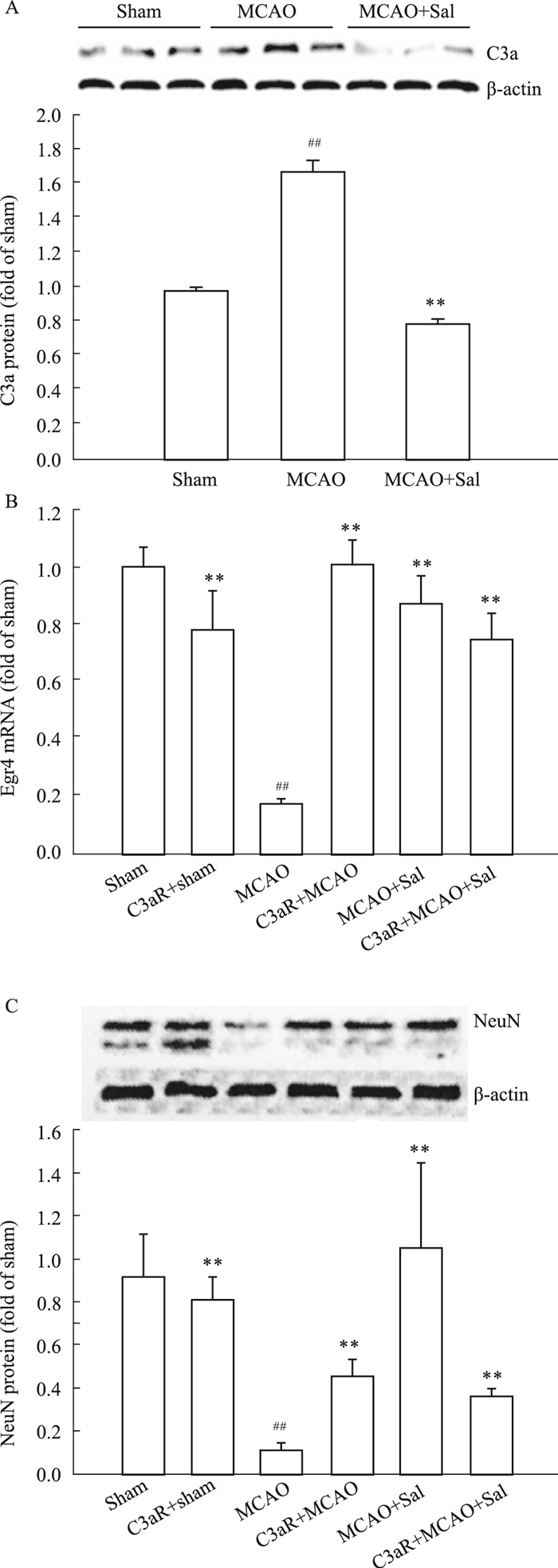 | Fig 4 Salidroside inhibited protein expression of C3a(A) and enhanced mRNA expression of Egr4 (B) and protein expression of NeuN(C) ##P < 0.01 vs sham; **P < 0.01 vs MCAO |